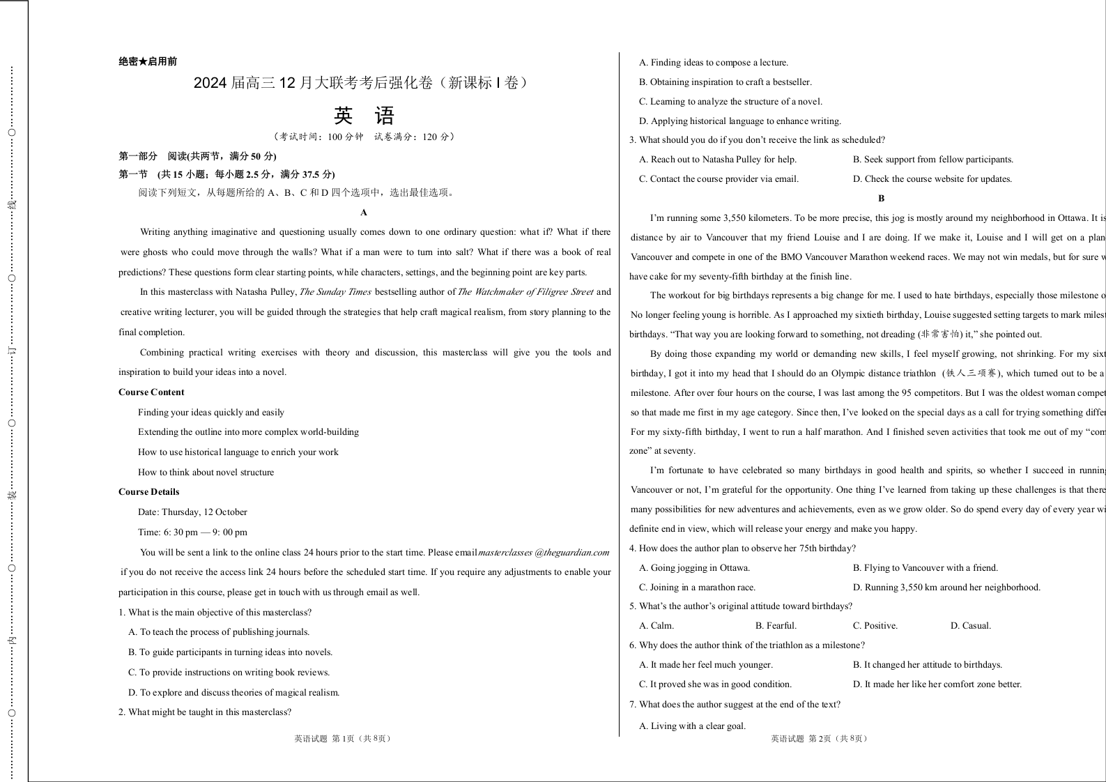 英语-2024届高三12月大联考考后强化卷(新课标I卷)(考试版)