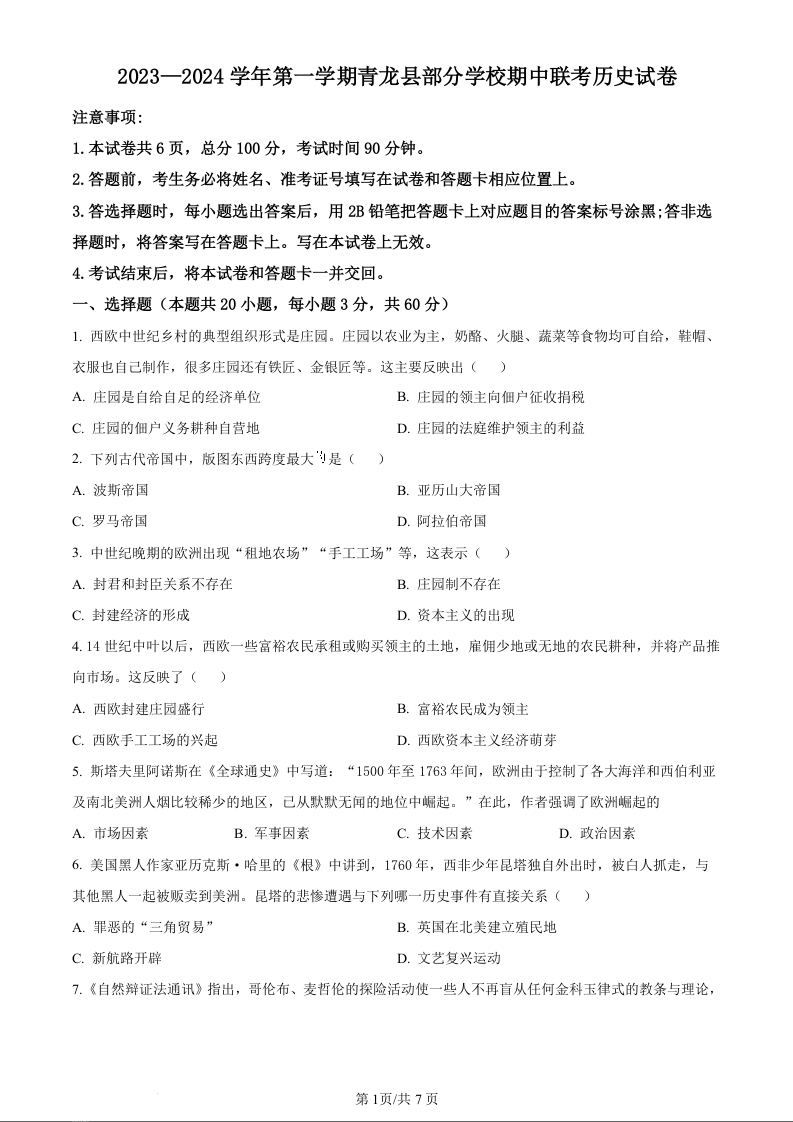 河北省秦皇岛市青龙县联考2023-2024学年高三上学期11月期中联考 历史
