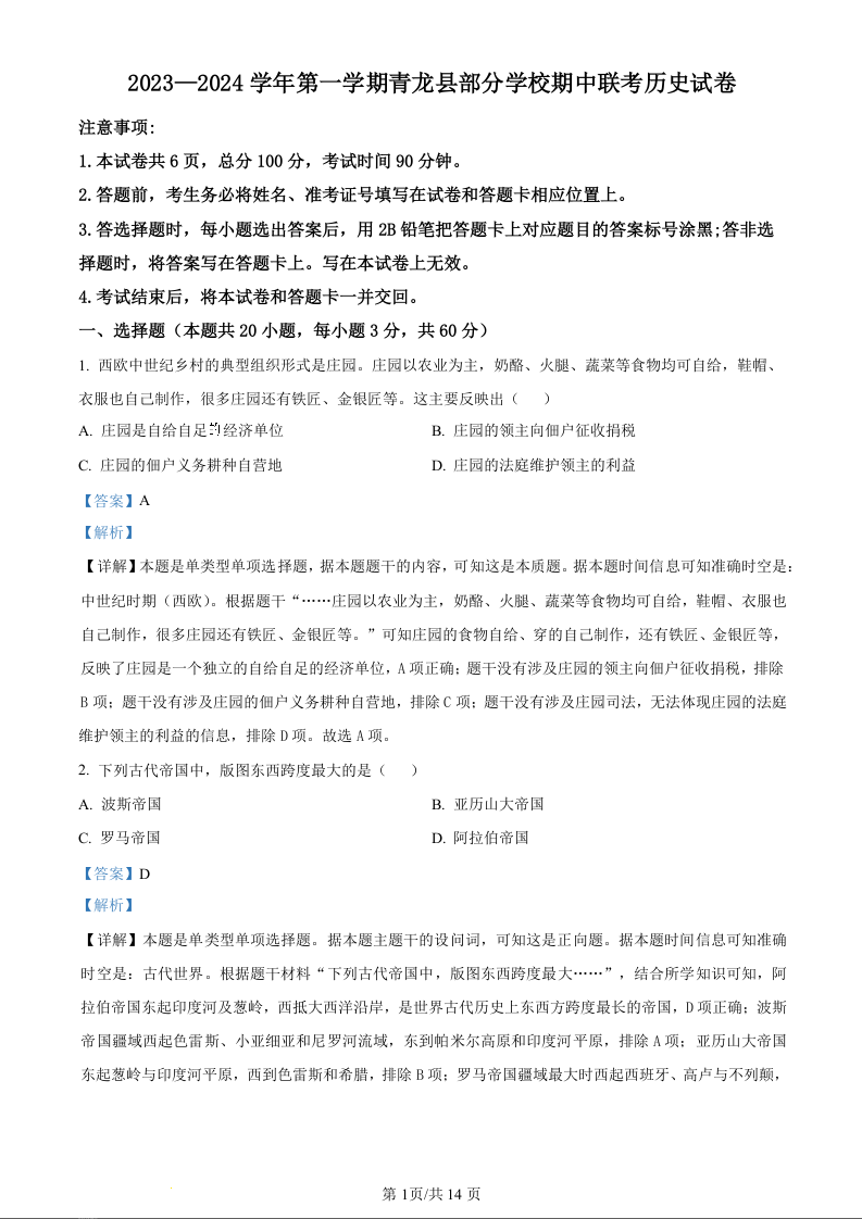河北省秦皇岛市青龙县联考2023-2024学年高三上学期11月期中联考 历史答案