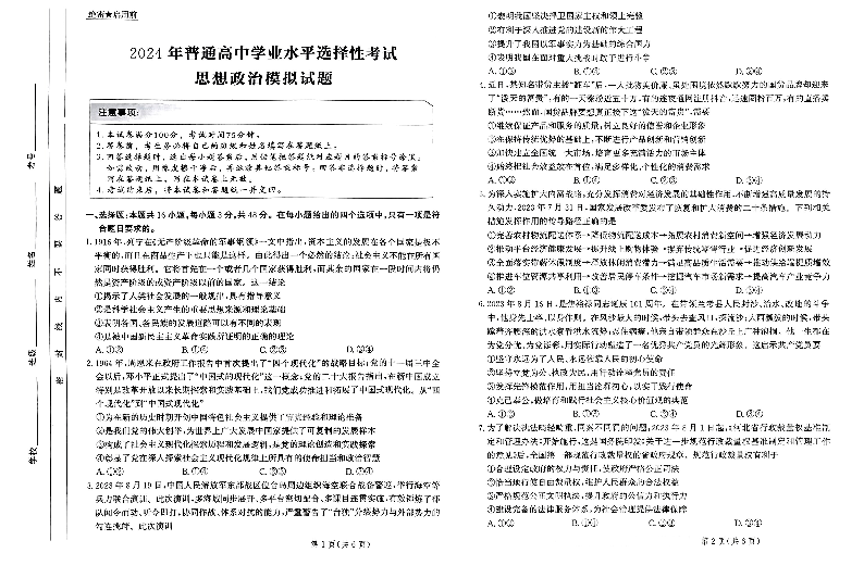 2024届河北省部分重点高中高三上学期学业水平选择性考试模拟 政治