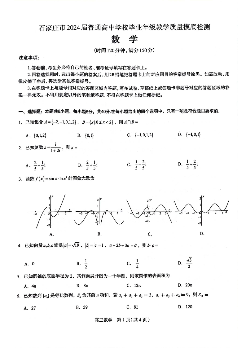 2024届河北省石家庄市普通高中学校毕业年级教学质量摸底检测 数学
