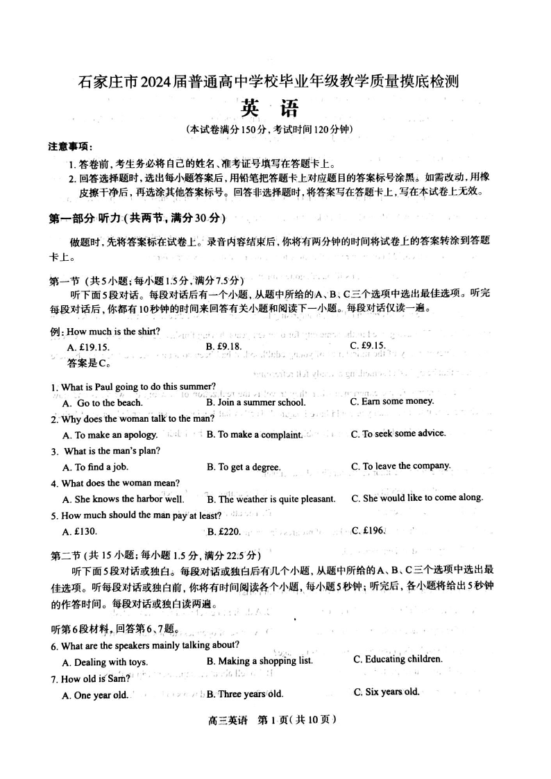 2024届河北省石家庄市普通高中学校毕业年级教学质量摸底检测 英语