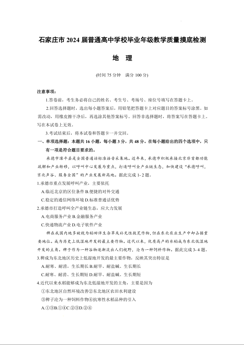 2024届河北省石家庄市普通高中学校毕业年级教学质量摸底检测 地理