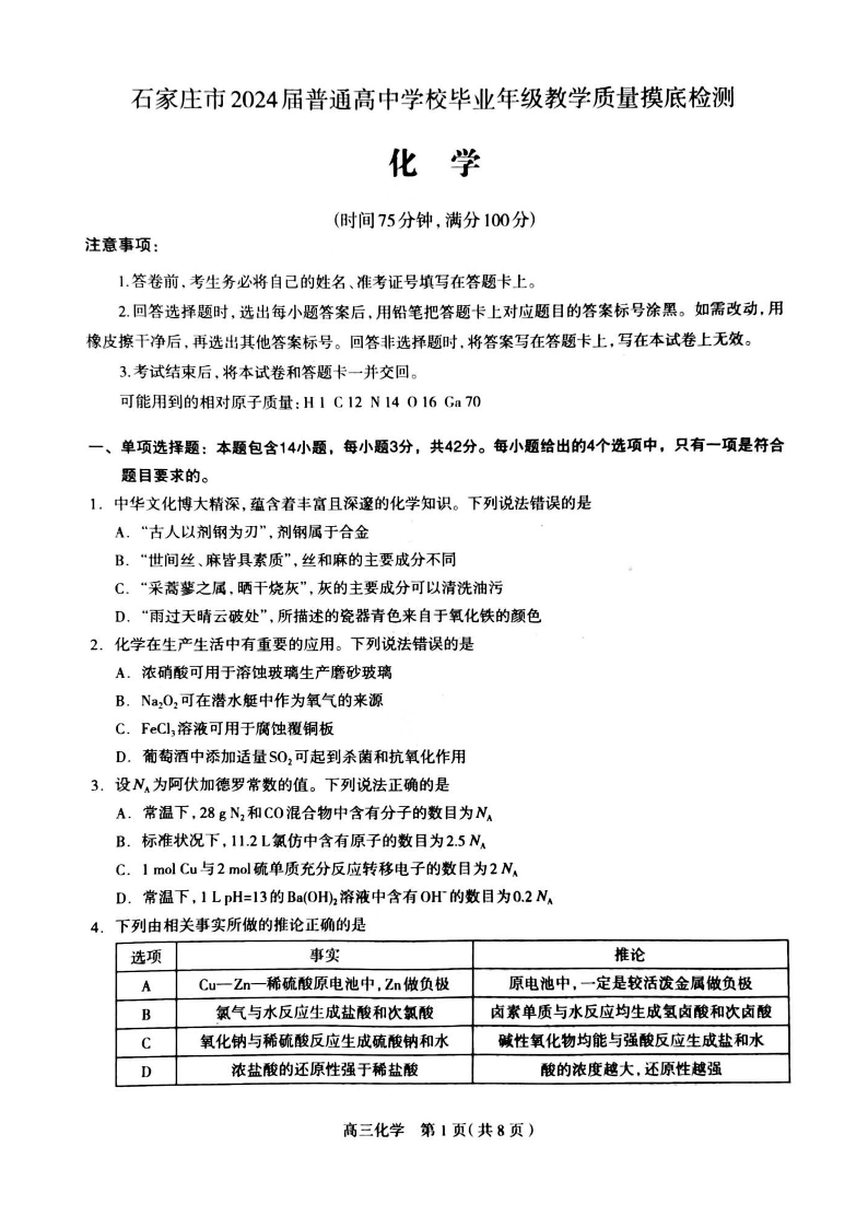 2024届河北省石家庄市普通高中学校毕业年级教学质量摸底检测 化学