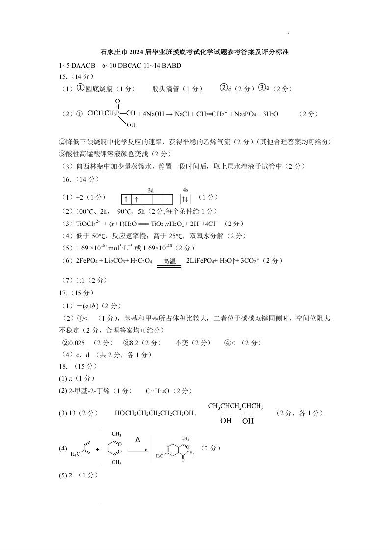 2024届河北省石家庄市普通高中学校毕业年级教学质量摸底检测 化学答案