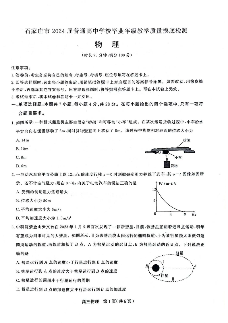 2024届河北省石家庄市普通高中学校毕业年级教学质量摸底检测 物理