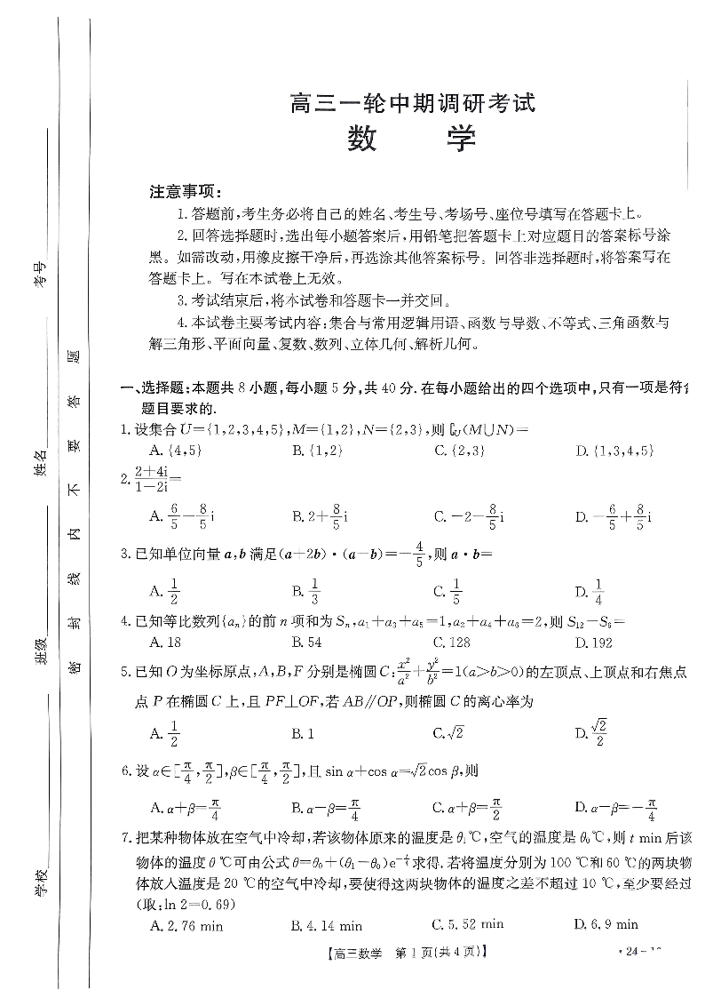 河北省廊坊2023-2024学年高三一轮中期调研考试 数学