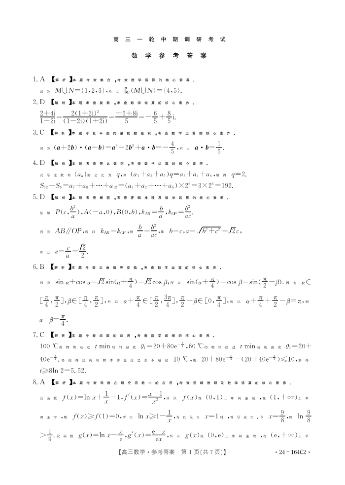 河北省廊坊2023-2024学年高三一轮中期调研考试 数学答案