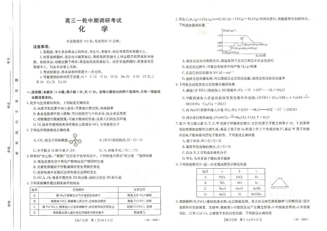 河北省廊坊2023-2024学年高三一轮中期调研考试 化学