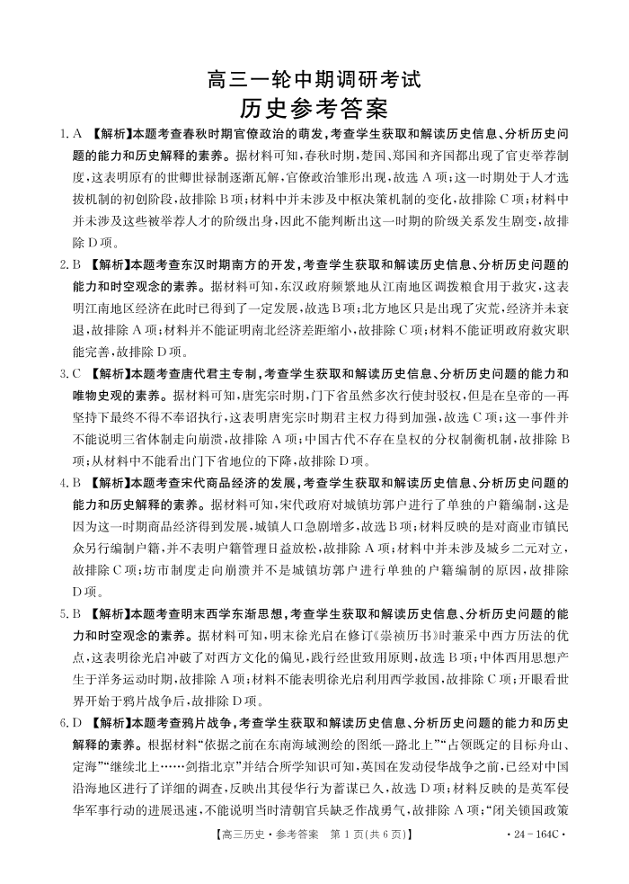 河北省廊坊2023-2024学年高三一轮中期调研考试 历史答案