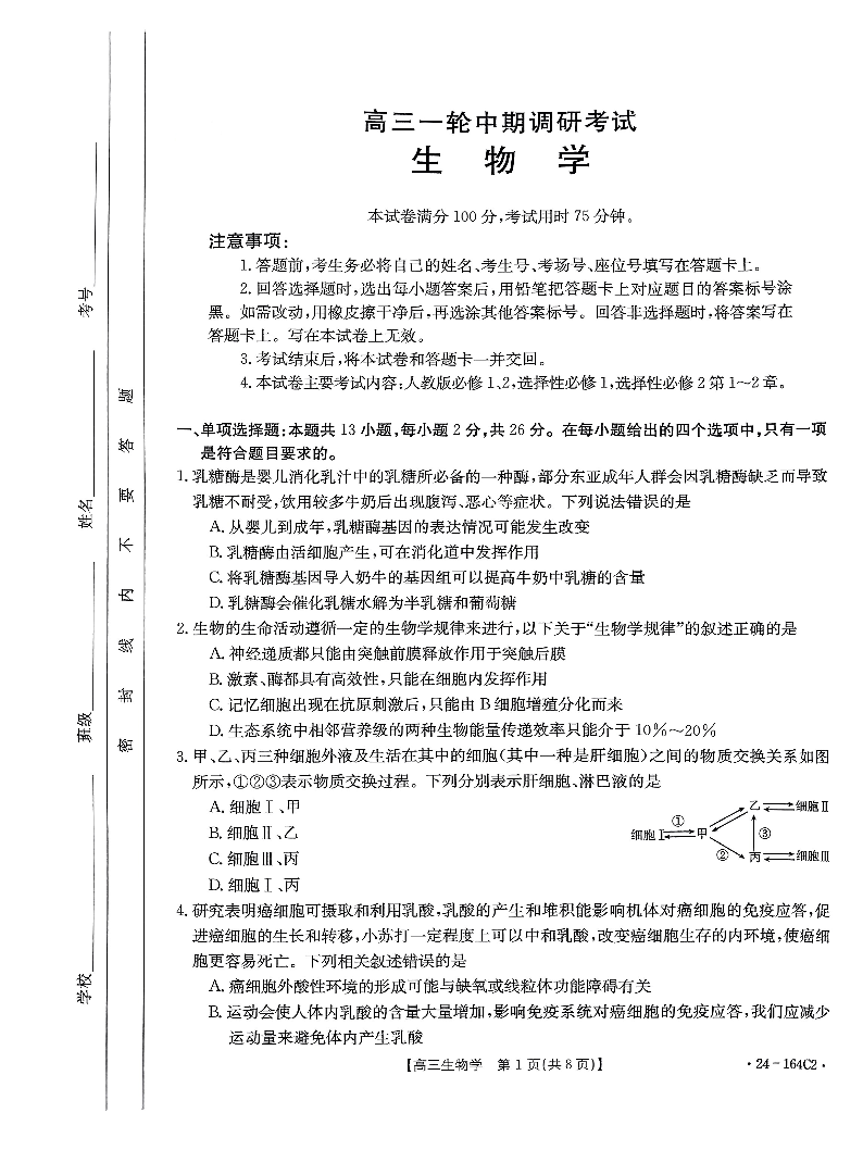 河北省廊坊2023-2024学年高三一轮中期调研考试 生物