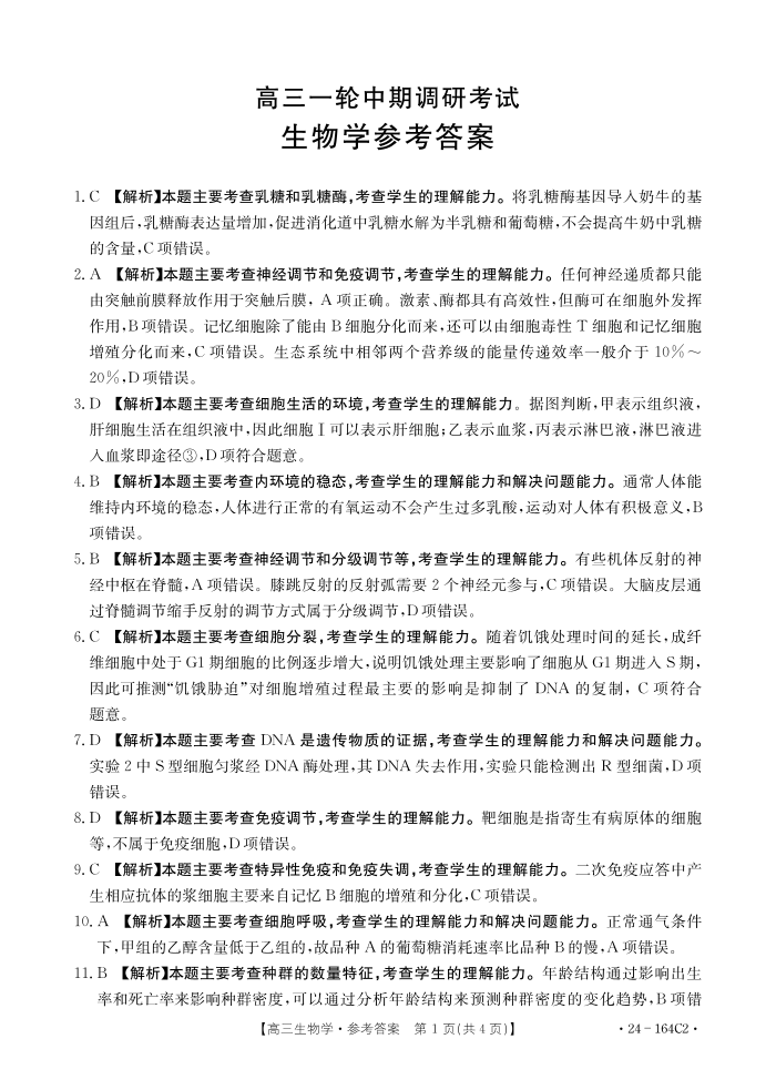 河北省廊坊2023-2024学年高三一轮中期调研考试 生物答案