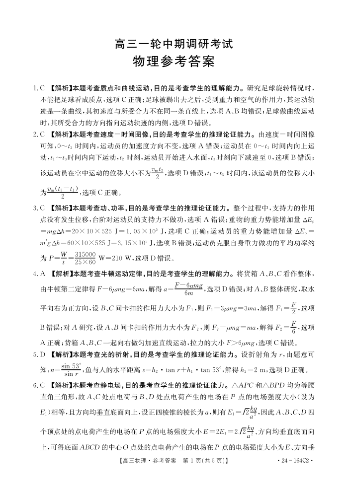河北省廊坊2023-2024学年高三一轮中期调研考试 物理答案