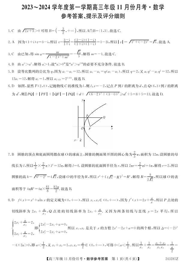 河北省沧州市东光县等三县联考2023-2024学年高三上学期11月月考 数学答案
