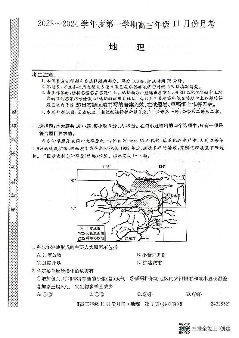 河北省沧州市东光县等三县联考2023-2024学年高三上学期11月月考 地理