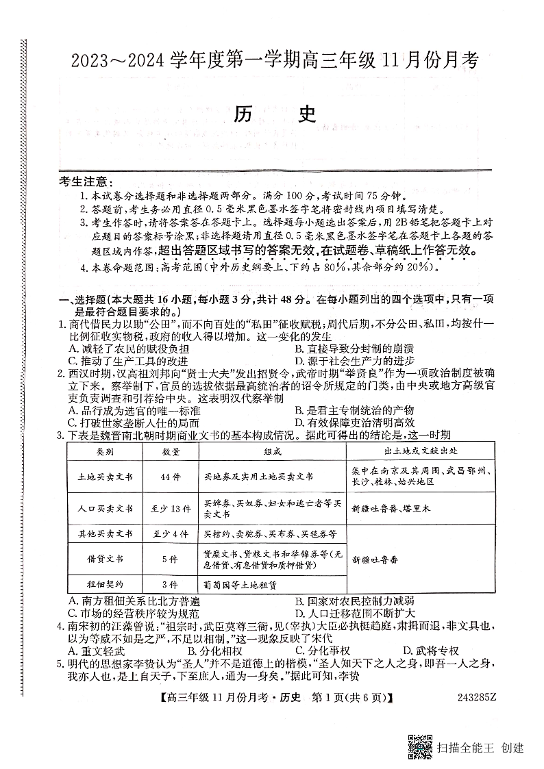 河北省沧州市东光县等三县联考2023-2024学年高三上学期11月月考 历史