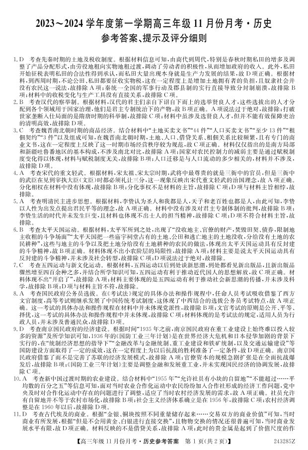 河北省沧州市东光县等三县联考2023-2024学年高三上学期11月月考 历史答案