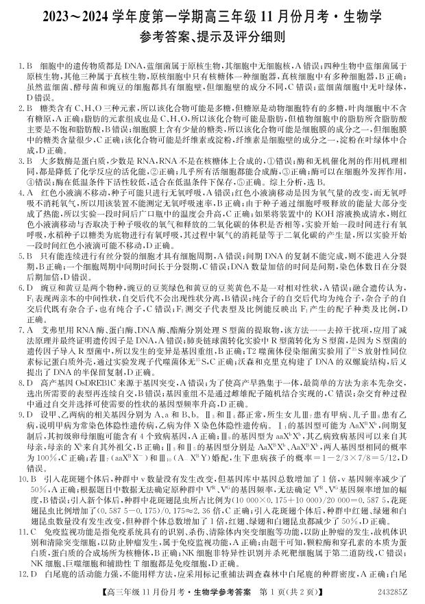 河北省沧州市东光县等三县联考2023-2024学年高三上学期11月月考 生物答案