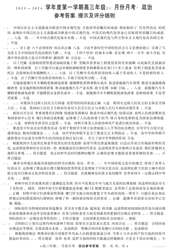 河北省沧州市东光县等三县联考2023-2024学年高三上学期11月月考 政治答案