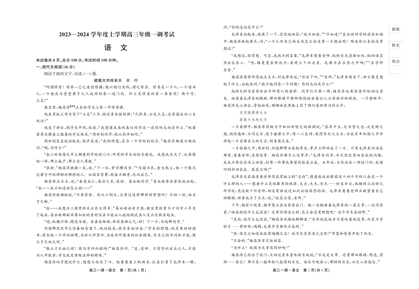 河北省石家庄市部分学校2023-2024学年高三上学期一调考试 语文