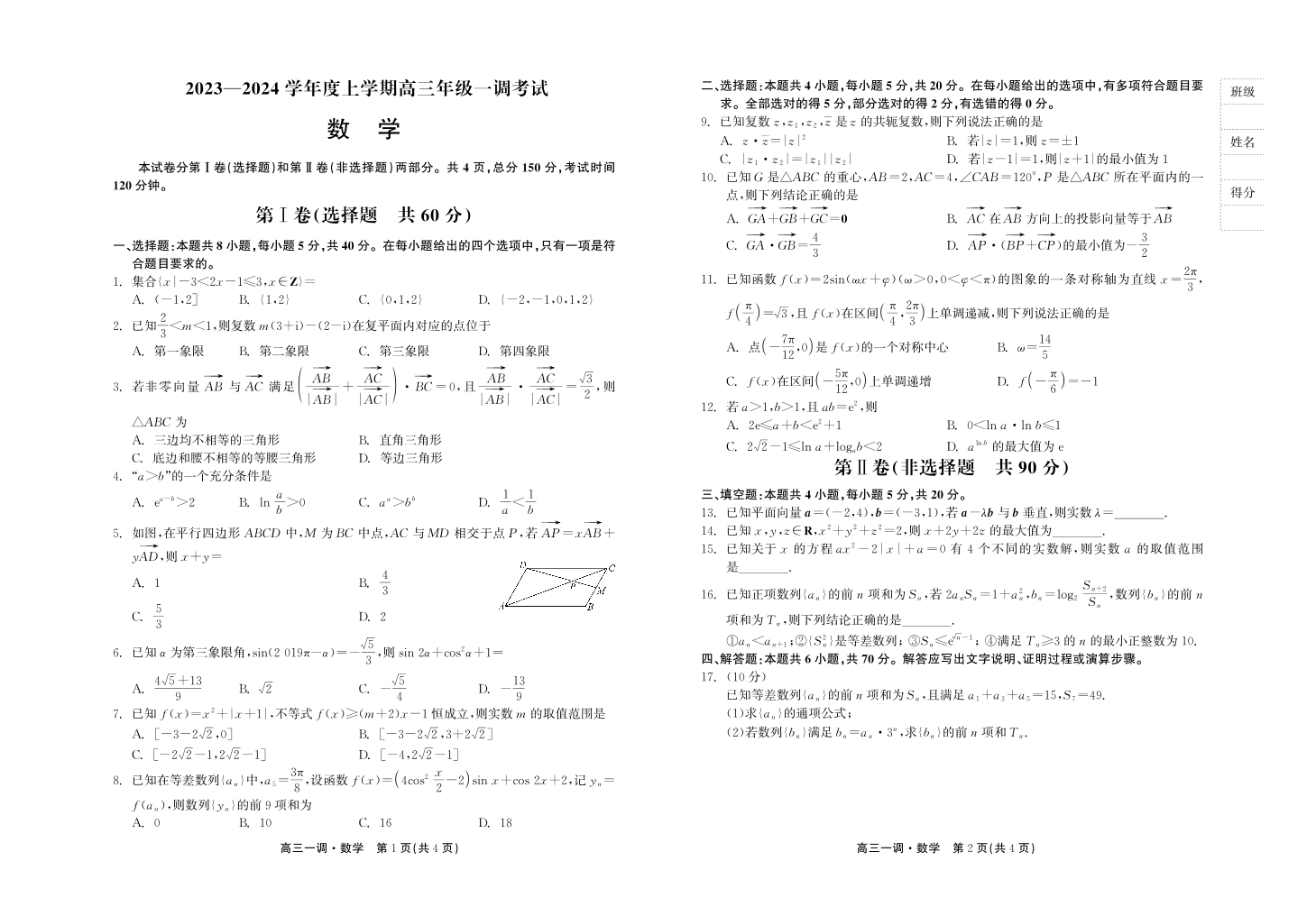 河北省石家庄市部分学校2023-2024学年高三上学期一调考试 数学