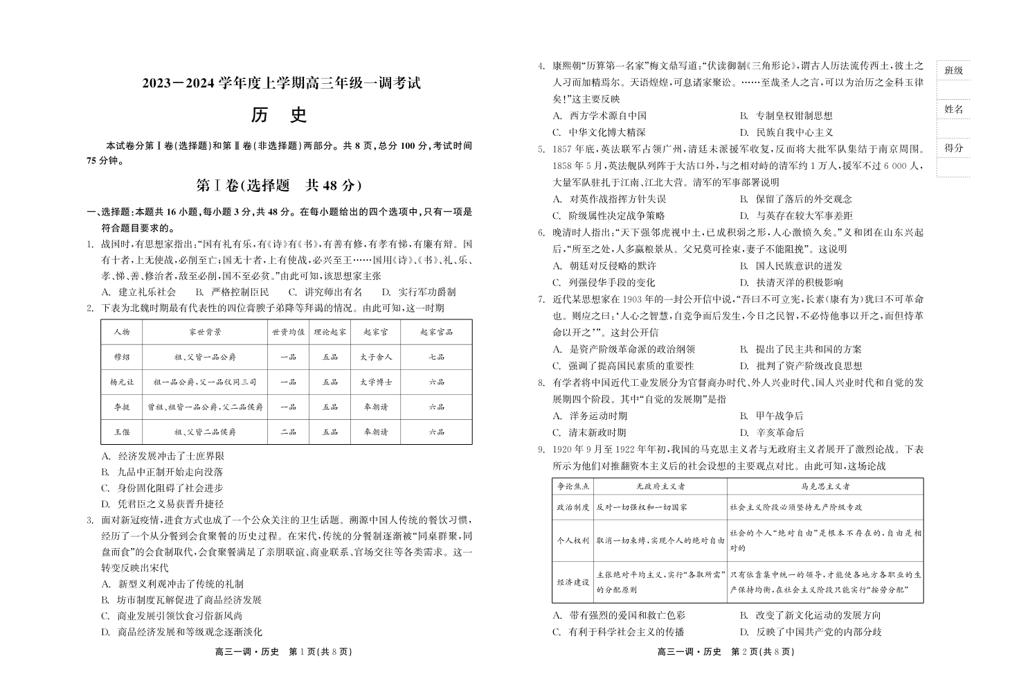 河北省石家庄市部分学校2023-2024学年高三上学期一调考试 历史