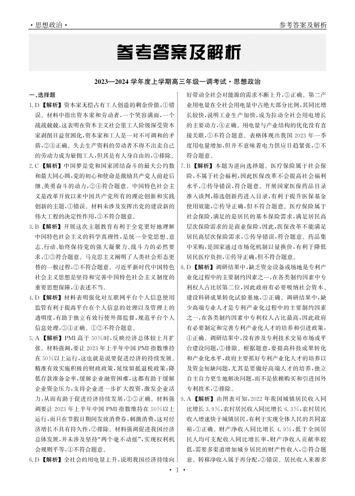 河北省石家庄市部分学校2023-2024学年高三上学期一调考试 政治答案