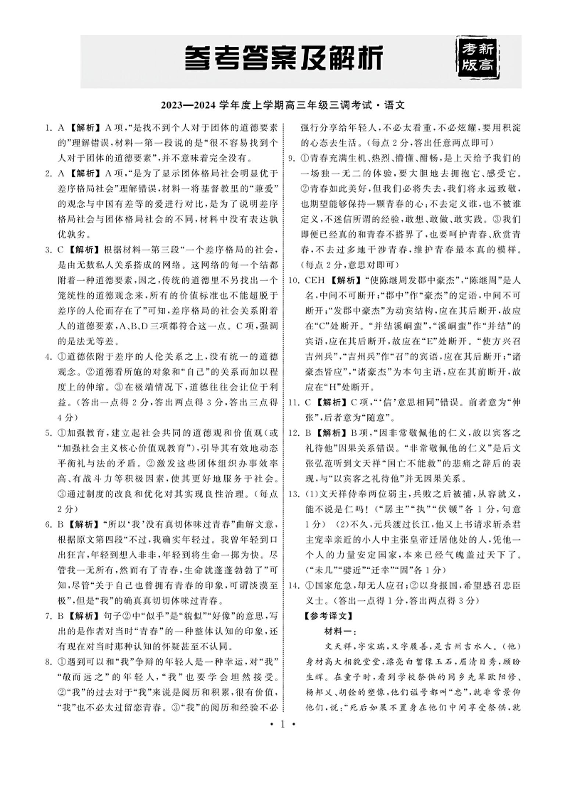 衡中同卷2023-2024学年度上学期高三年级三调考试 语文答案