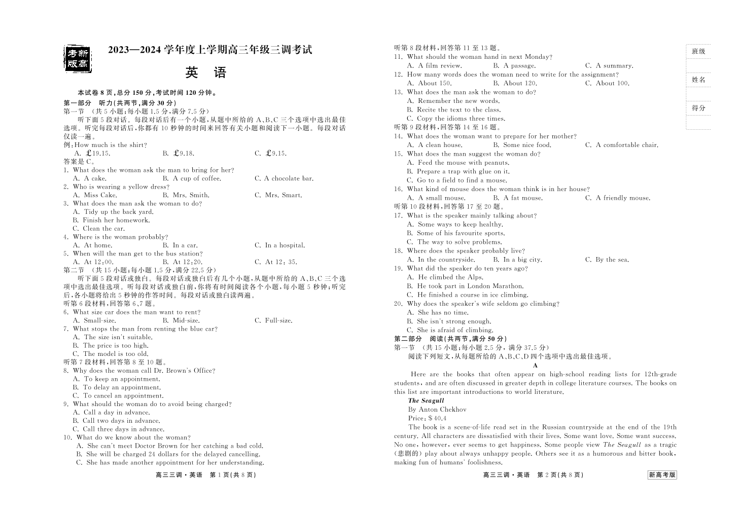 衡中同卷2023-2024学年度上学期高三年级三调考试 英语