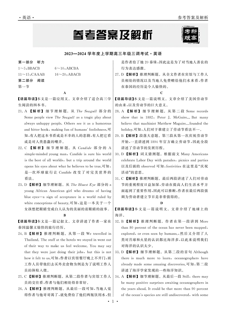 衡中同卷2023-2024学年度上学期高三年级三调考试 英语答案