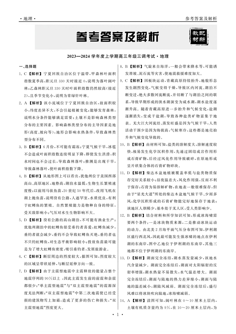 衡中同卷2023-2024学年度上学期高三年级三调考试 地理答案
