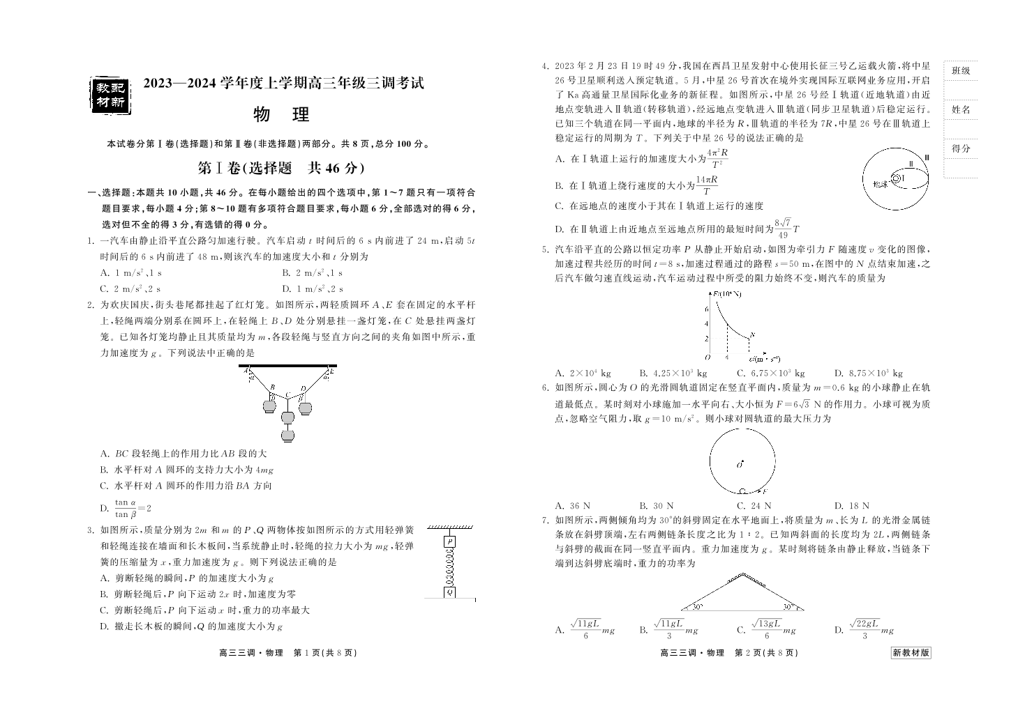 衡中同卷2023-2024学年度上学期高三年级三调考试 物理
