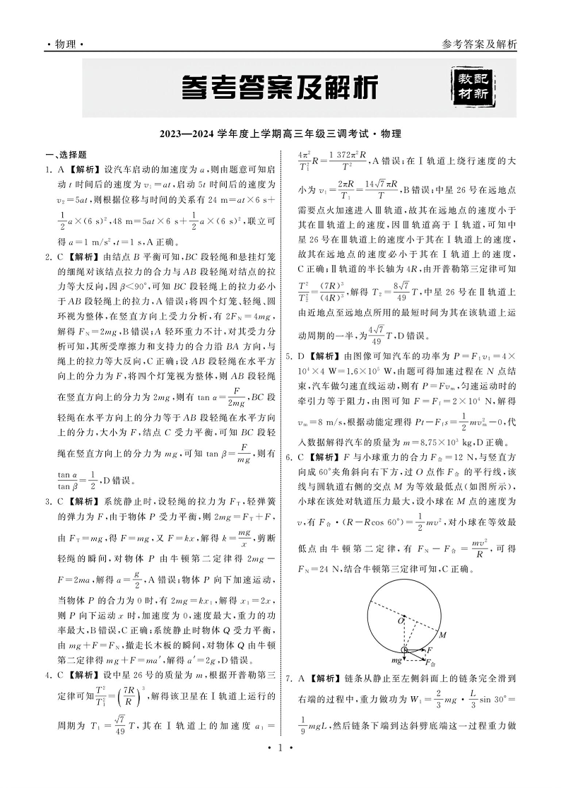 衡中同卷2023-2024学年度上学期高三年级三调考试 物理答案