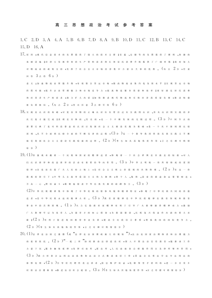 河北省保定市部分高中2023-2024学年高三上学期10月联考 政治答案