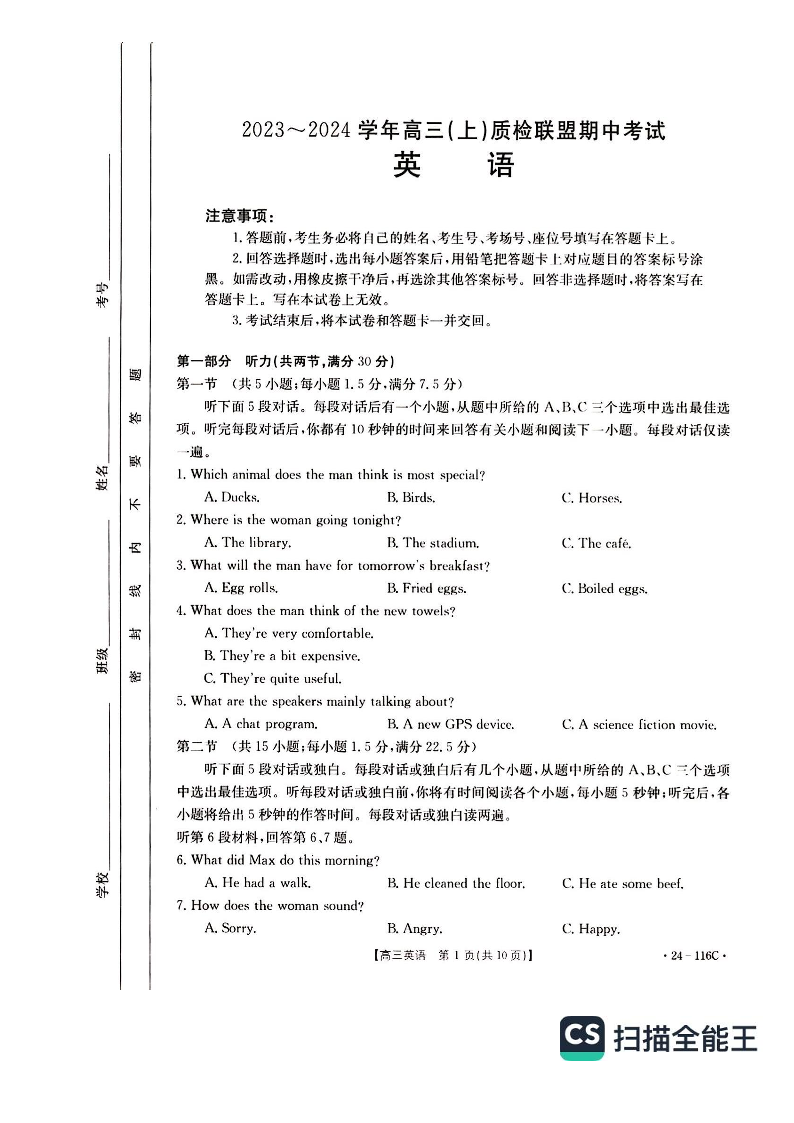 河北省邢台市四校质检联盟2023-2024学年高三上学期期中考试 英语