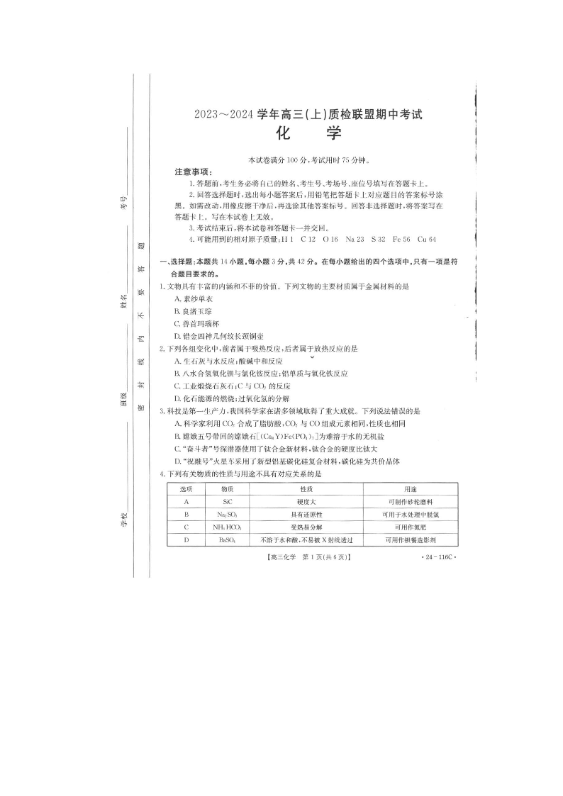 河北省邢台市四校质检联盟2023-2024学年高三上学期期中考试 化学