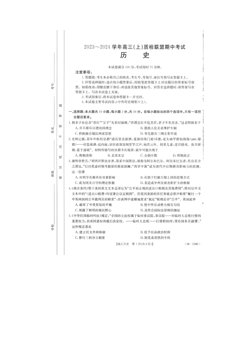 河北省邢台市四校质检联盟2023-2024学年高三上学期期中考试 历史