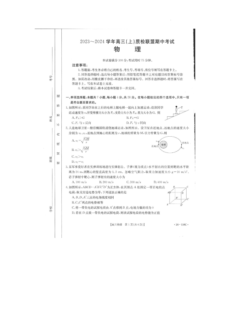 河北省邢台市四校质检联盟2023-2024学年高三上学期期中考试 物理