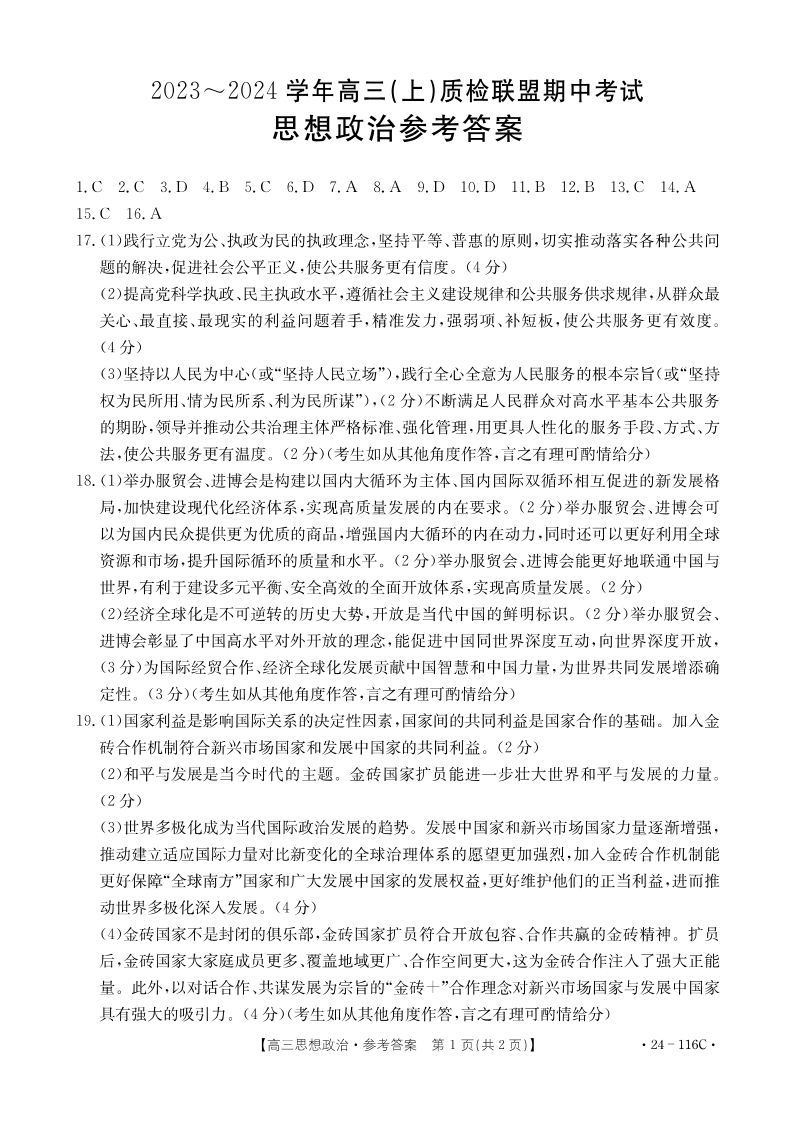 河北省邢台市四校质检联盟2023-2024学年高三上学期期中考试 政治答案