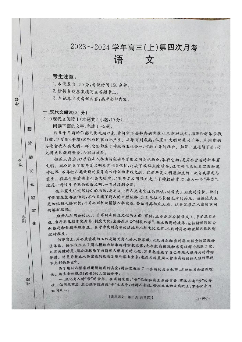 河北省邢台市五岳联盟2023-2024学年高三上学期第四次月考 语文