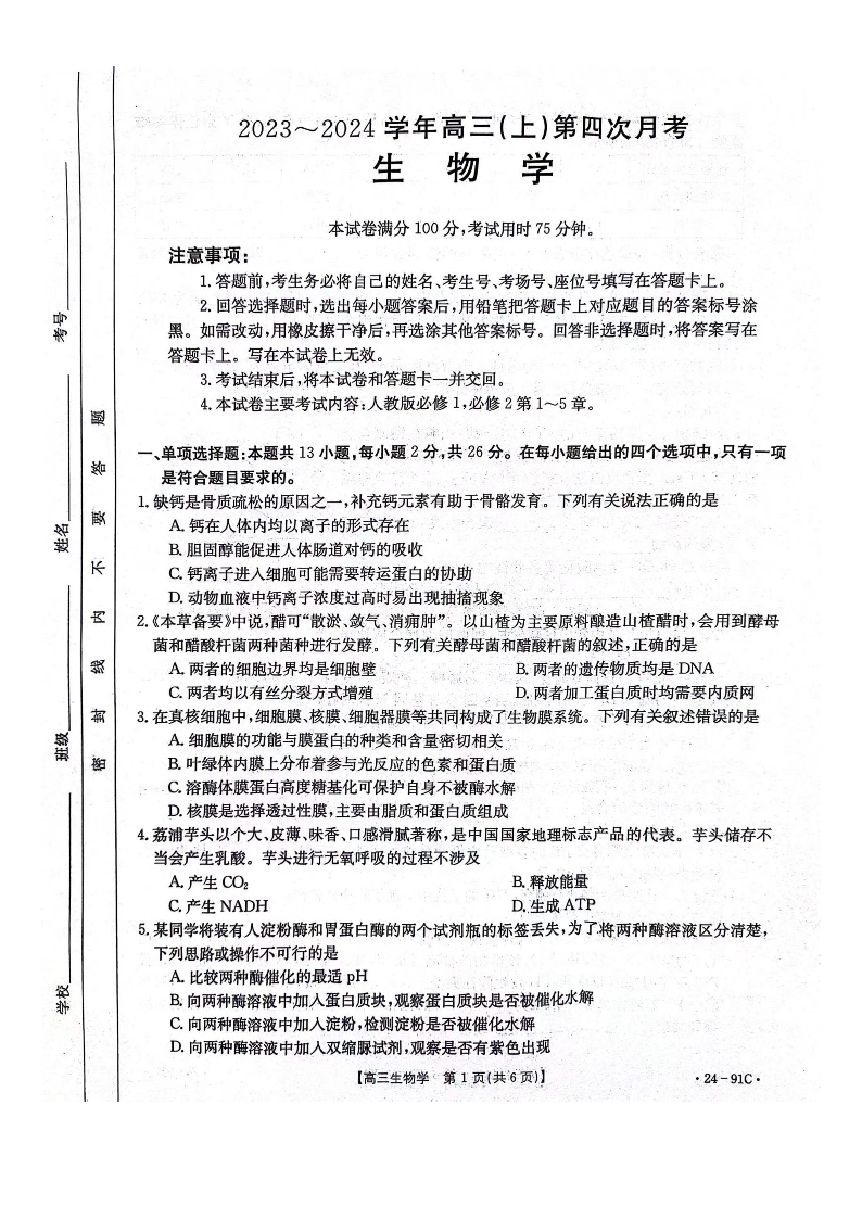 河北省邢台市五岳联盟2023-2024学年高三上学期第四次月考 生物
