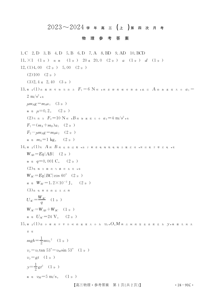 河北省邢台市五岳联盟2023-2024学年高三上学期第四次月考 物理答案