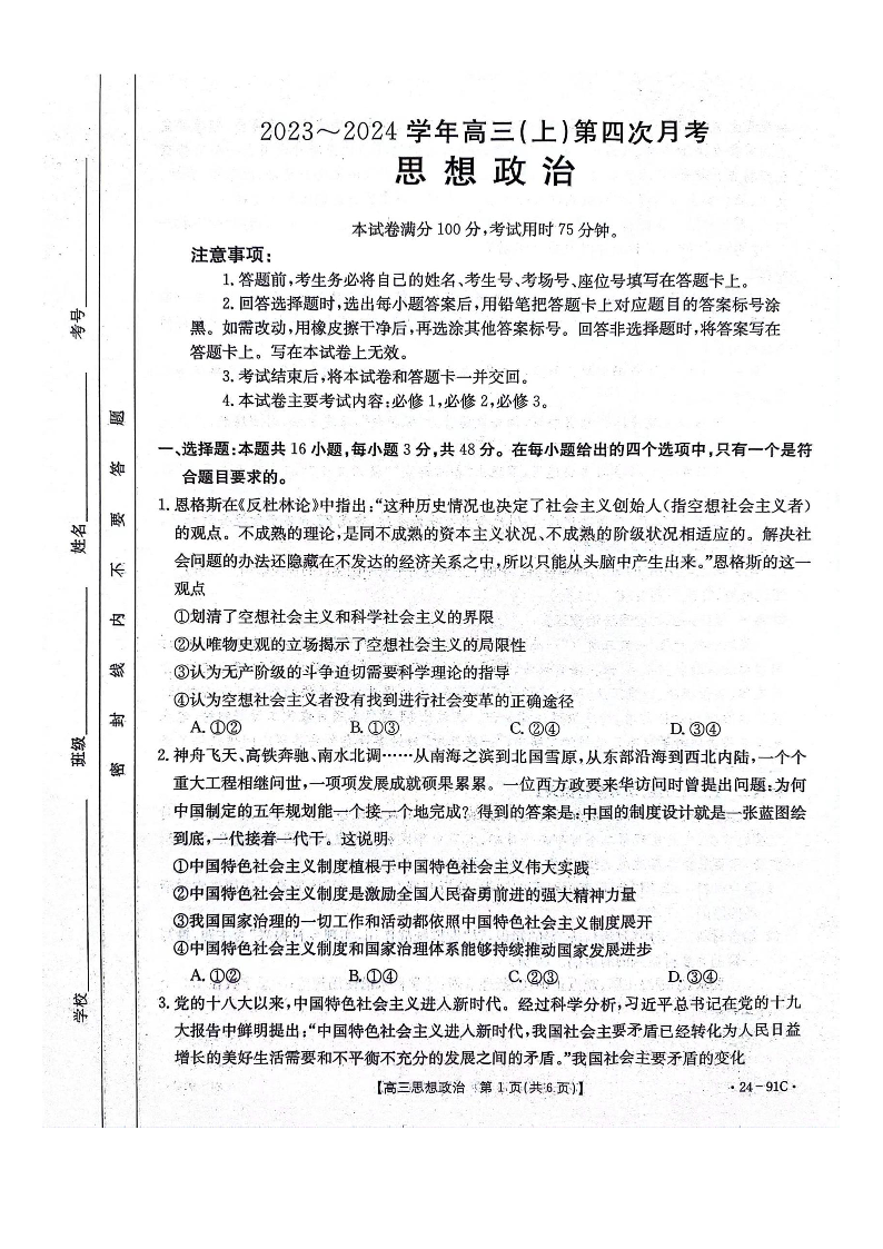 河北省邢台市五岳联盟2023-2024学年高三上学期第四次月考 政治