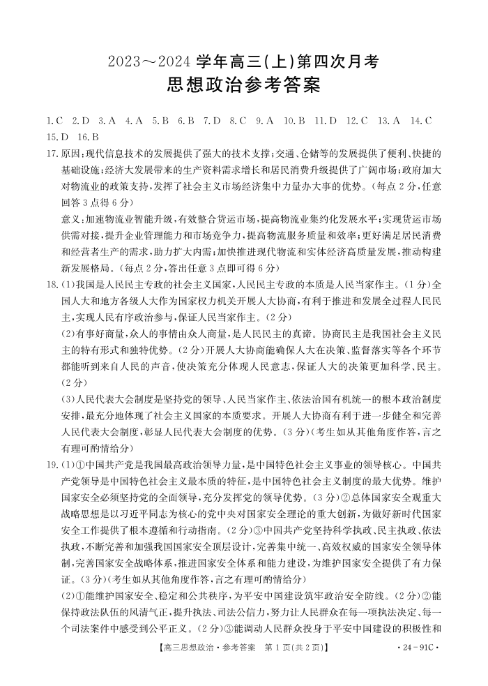 河北省邢台市五岳联盟2023-2024学年高三上学期第四次月考 政治答案