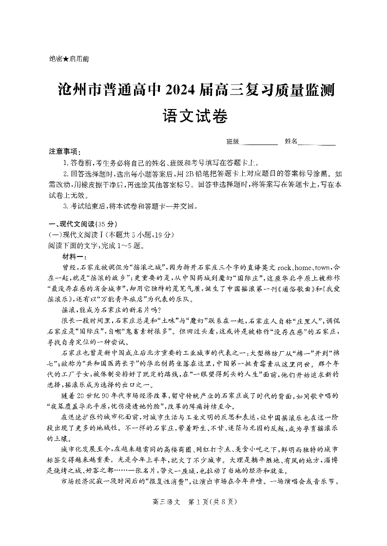 河北省沧州市部分学校2023-2024学年高三上学期10月联考 语文