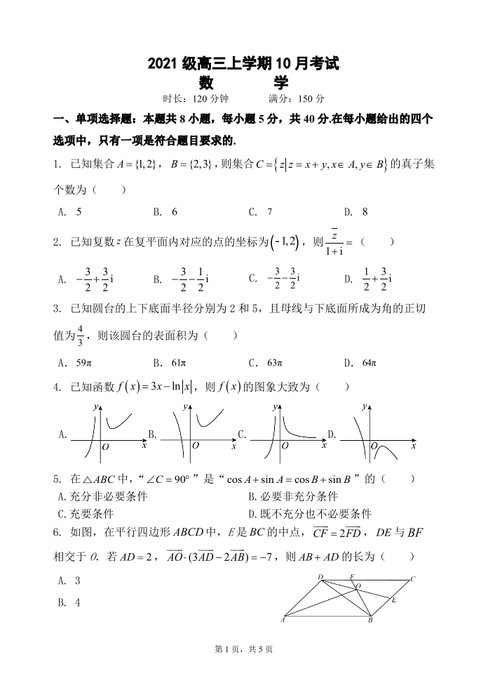 河北省保定市唐县第一中学2024届高三上学期10月月考 数学