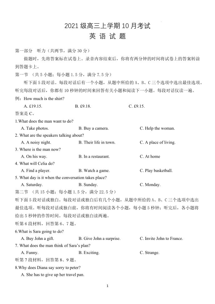 河北省保定市唐县第一中学2024届高三上学期10月月考 英语