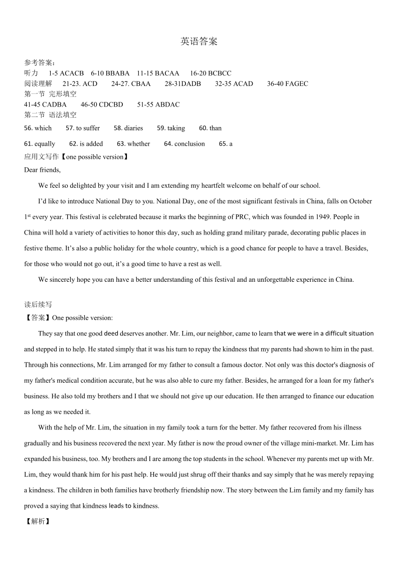 河北省保定市唐县第一中学2024届高三上学期10月月考 英语答案