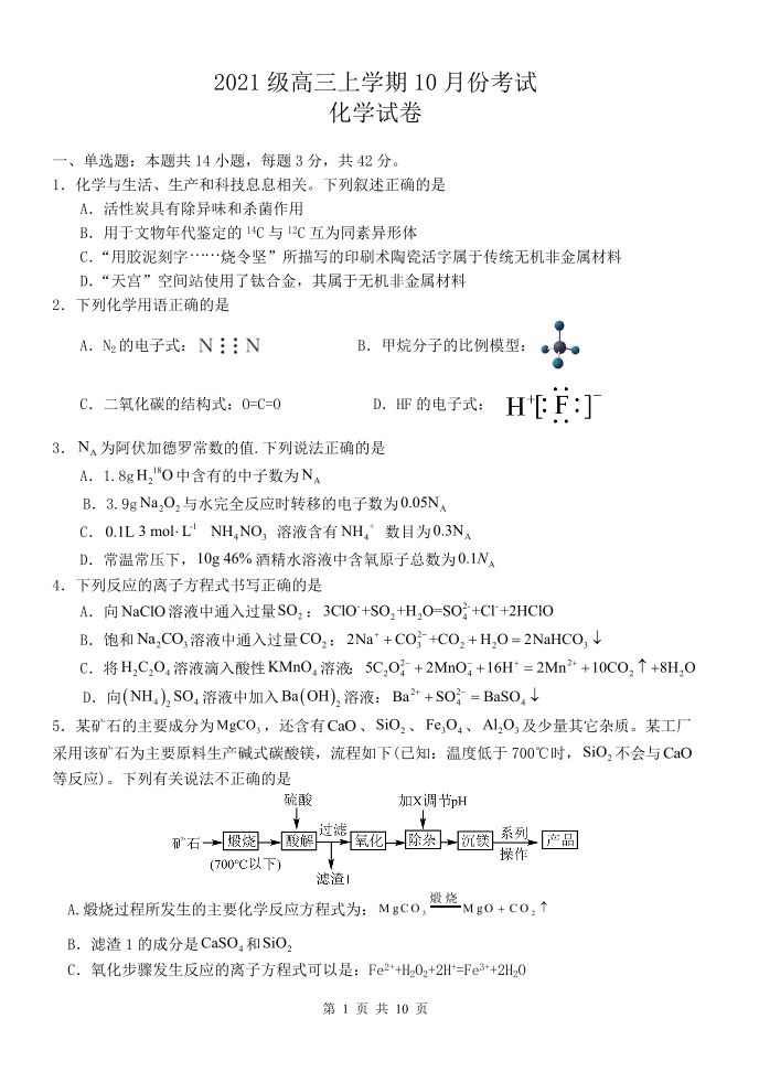 河北省保定市唐县第一中学2024届高三上学期10月月考 化学