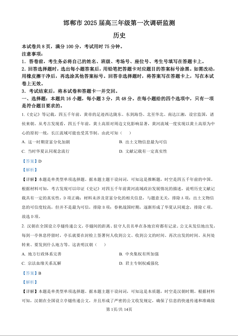 邯郸市2025+届高三年级第一次调研监测+历史答案
